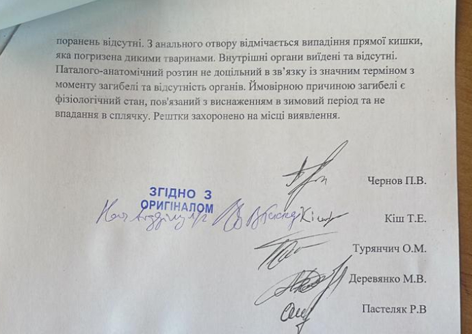 Дослівно: "Також група могла пересвідчитись про наявність акту комісії, яка підтвердила (фото додаються), що смерть тварини – самця ведмедя (не ведмедиці), настала внаслідок природних причин, а на тілі тварини не виявлено слідів вогнепальних поранень.
