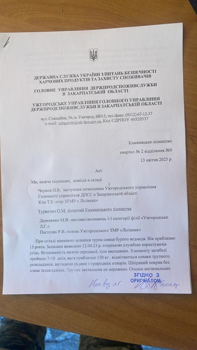 Акт підписаний представниками Ужгородського управління Держпродспоживслужби в Закарпатській області, Кам’яницького лісництва, головою та єгерем Закарпатського товариства мисливців і рибалок "Лісівник", а також мисливствознавцем Ужгородського лісового господарства.