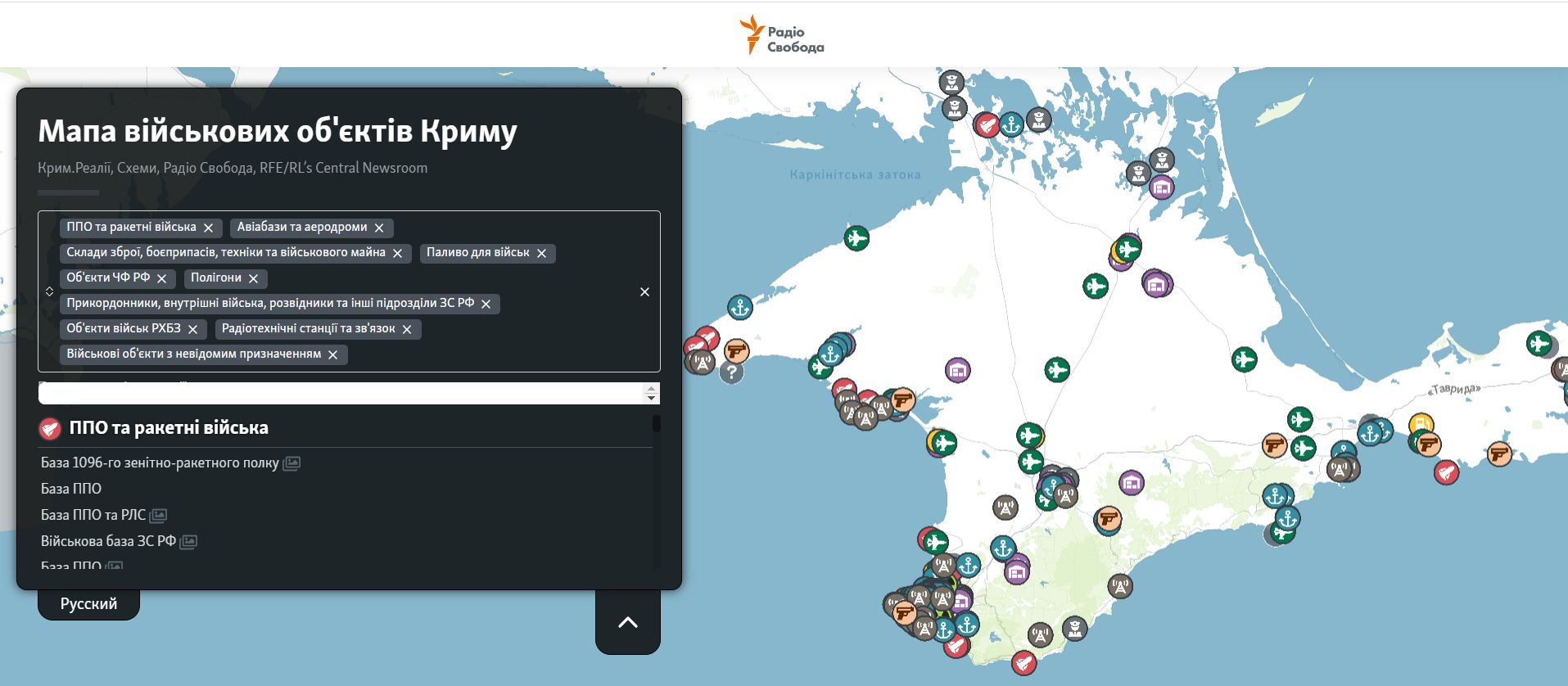 Усі ці дані з точними координатами та фотографіями розміщені на інтерактивній карті, яку створили журналісти "Крим.Реалії", проєкту Радіо Свобода "Схеми", фрілансери з Криму, військові експерти та фахівці Центральної служби новин RFE/RL.