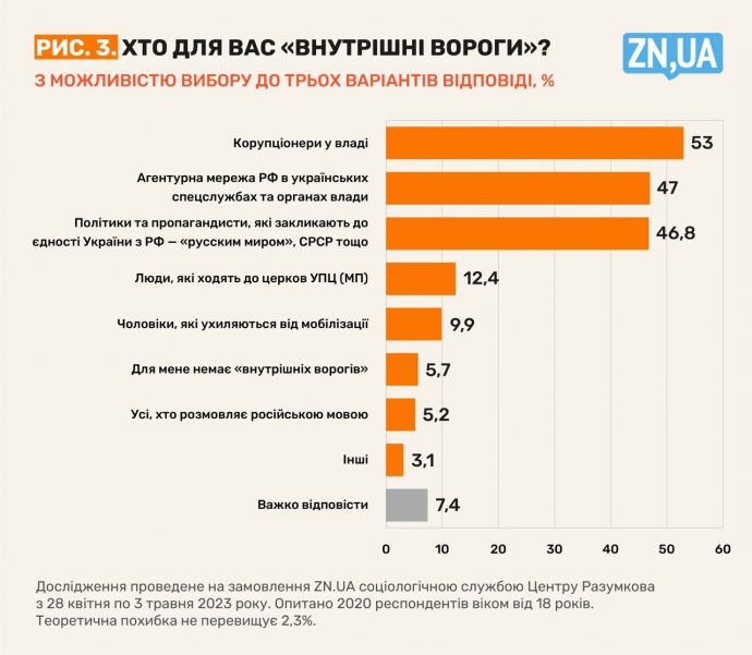 Деталі: "На запитання "Хто для вас "внутрішні вороги"?" 53% опитаних чітко вказують, що це – корупціонери у владі.