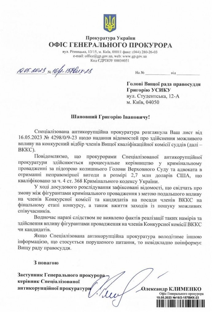 Така відповідь керівника Спеціалізованої антикорупційної прокуратури на запит голови Вищої ради правосуддя оприлюднена "у зв’язку зі значним суспільним резонансом стосовно можливого впливу на процес відбору членів Вищої кваліфікаційної комісії суддів колишнім головою Верховного Суду та з метою уникнення будь-яких маніпуляцій".