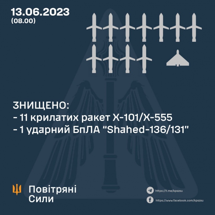 Українські сили й засоби протиповітряної оборони Повітряних Сил знищили 10 крилатих ракет та один ударний дрон.
