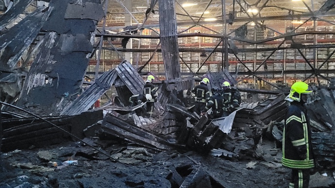 Деталі: Влучання ворожої ракети у складське приміщення однієї з торговельних мереж спричинило руйнування в 1000 кв. м та пожежу на площі 400 кв. м.