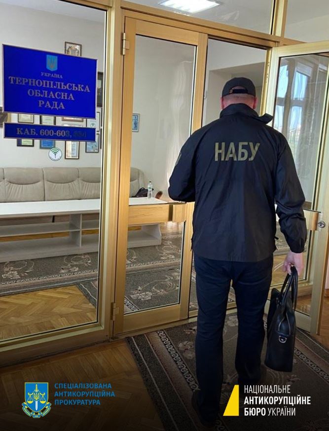 Дослівно: "НАБУ і САП затримали голову Тернопільської облради та двох заступників голови Тернопільської військово-цивільної адміністрації на одержанні неправомірної вигоди".