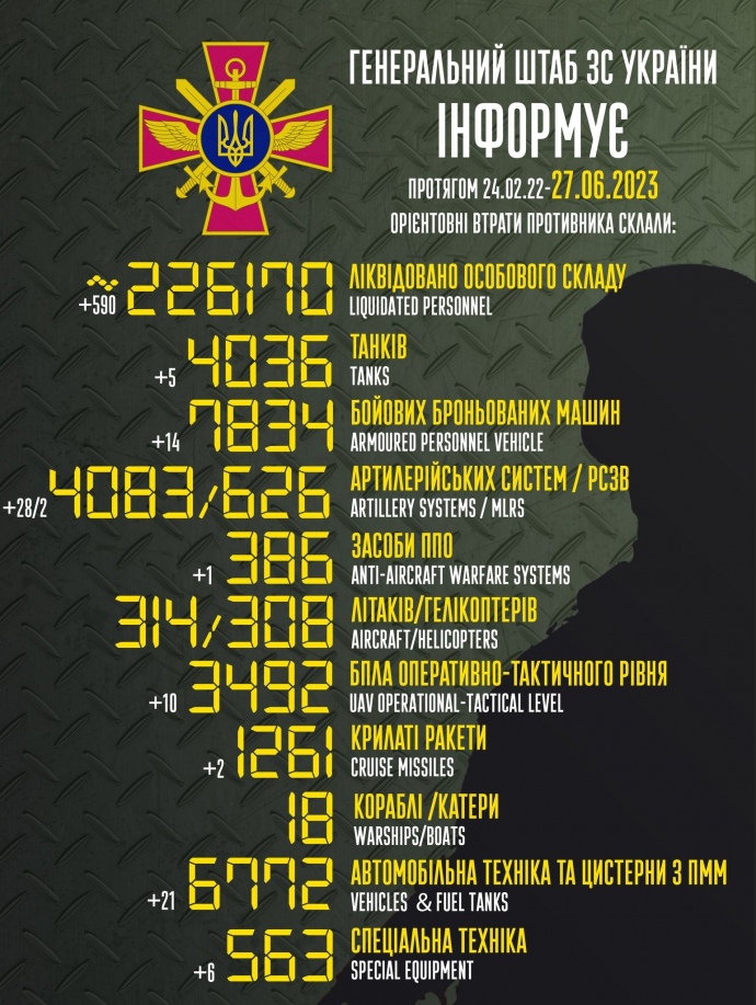 Деталі: За даними українського Генштабу, загальні бойові втрати Російської Федерації з 24.02.22 по 27.06.23 орієнтовно склали: