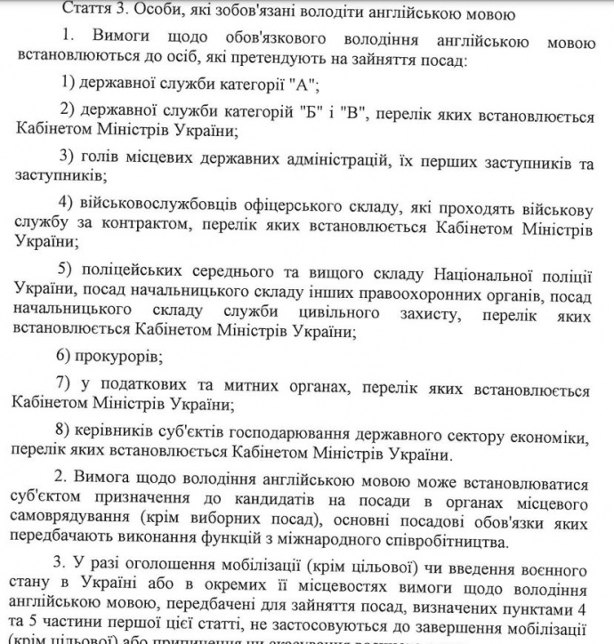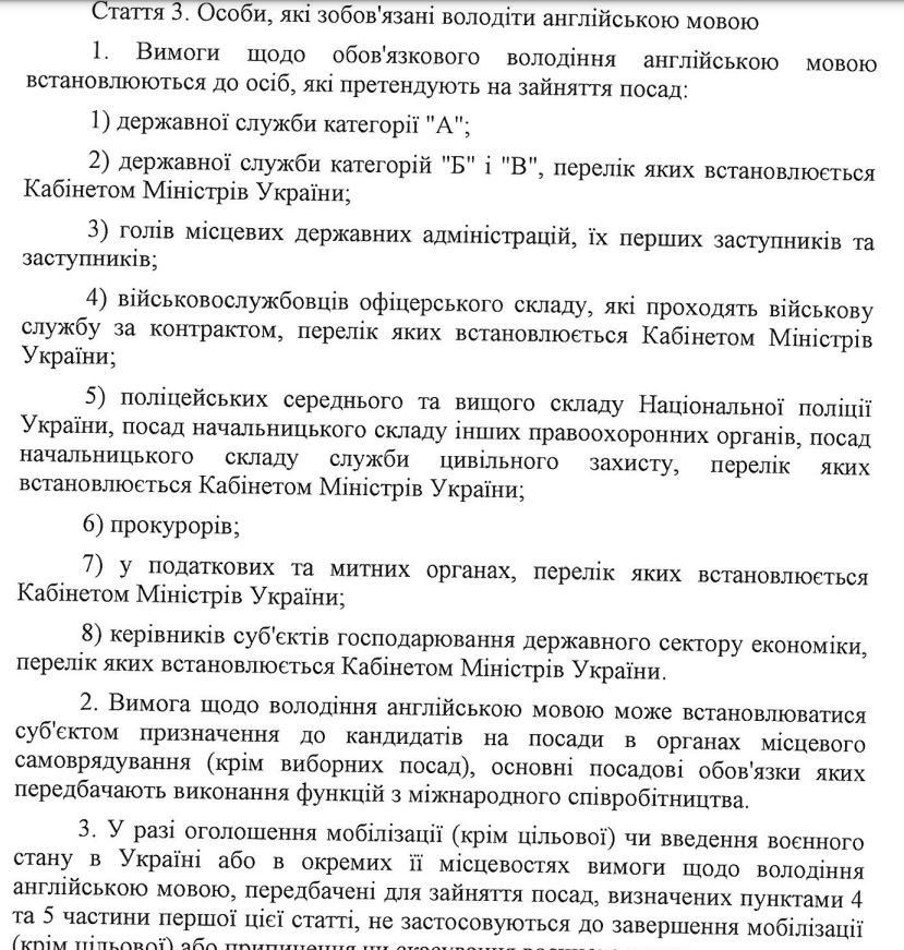 Втім, під час воєнного стану та мобілізації на військовослужбовців та правоохоронців вимога володіти англійською мовою не розповсюджується.