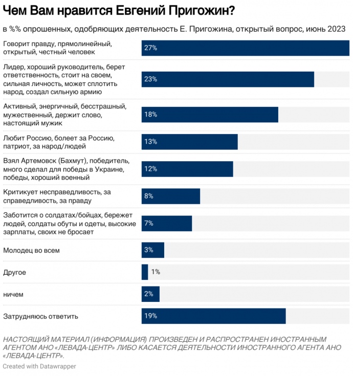 Серед характеристик Пригожина, які виділяють найчастіше, 27% опитаних називали його прямолінійність, відкритість і чесність; 23% відзначали його лідерські якості ("гарний керівник", "може згуртувати народ", "створив сильну армію"); 18% підкреслити його енергійність. Рідше його називали "патріотом", "хорошим військовим", ставили в заслугу взяття Бахмута.