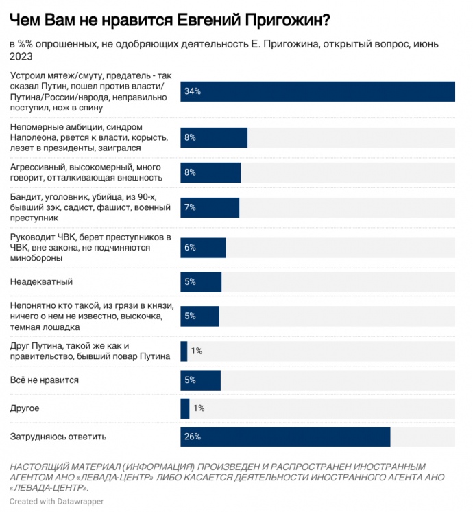 Опитані, які не схвалюють діяльність Євгена Пригожина (під кінець опитування ця думка почала переважати), говорили, що він "влаштував заколот, пішов проти влади/Путіна/Росії/народу" (34%), а також зазначали, що у нього "непомірні амбіції", "він лізе у президенти" та він "агресивний, зарозумілий, багато говорить" (по 8%), 7% називали "бандитом".