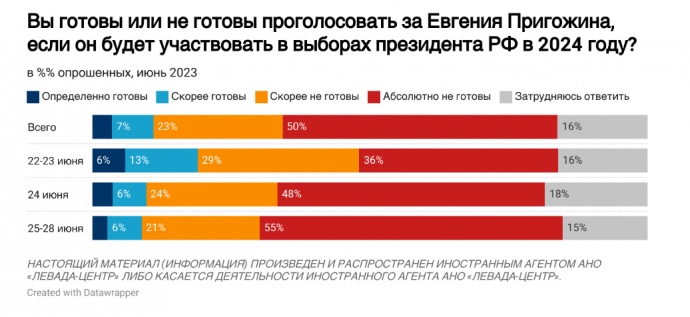 До спроби заколоту 19% респондентів були готові підтримати Пригожина, якби він узяв участь у президентських виборах 2024 року. Після 24 червня частка таких опитаних знизилася вдвічі – до 10%.