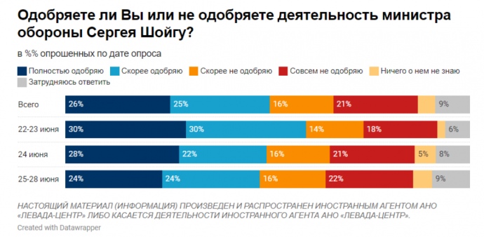 Також після заколоту знизився рівень схвалення дій міністра оборони Сергія Шойгу, якого Пригожин звинуватив в ударах по таборах найманців, спробі знищити його ПВК та іншому. Тижнем раніше діяльність міністра схвалювали 60% респондентів, а після заколоту – 48%.