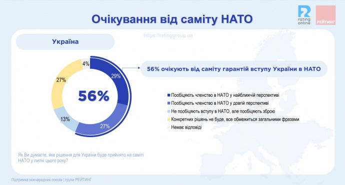 56% респондентів очікують від саміту гарантій вступу України до НАТО: 29% – у короткостроковій перспективі, 27% – у довгостроковій.
