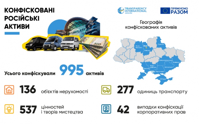 Довідково: На сьогодні в Україні конфісковано $85 тис. та понад 77 млн грн грошових активів, 136 об'єктів нерухомості, 277 одиниць транспорту, корпоративні права та акції 39 підприємств та 3 банків, а також 537 цінностей і творів мистецтва.