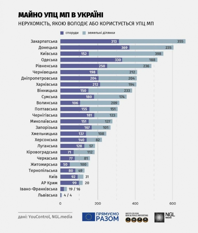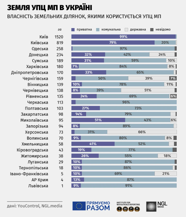 NGL.media також встановили, що переважна більшість майна, яким користується УПЦ МП належить до комунальної власності − лише у Києві та Київській області переважає приватна власність.