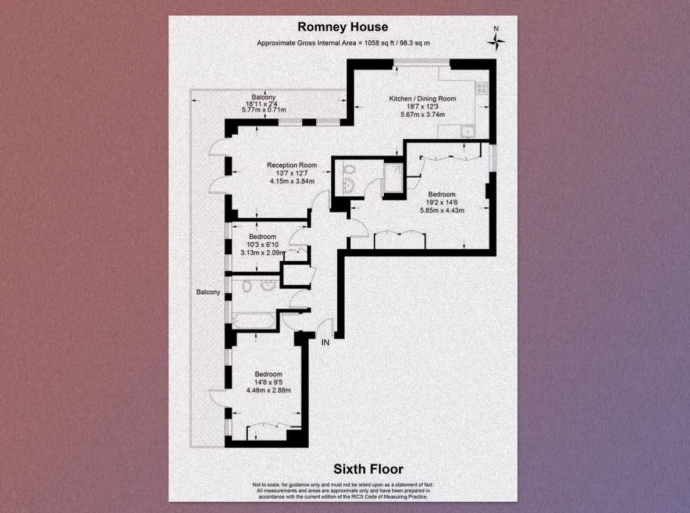 Квартира площею менше 100 кв.м, у ній три спальні, вітальня, кухня-їдальня, балкон. У будинку є тренажерний зал, з даху відкривається вид на Біг-Бен.