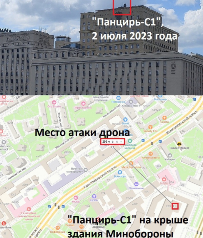 Зенітно-ракетний комплекс "Панцир-С1" на даху штаб-квартири Міністерства оборони Росії не зміг зранку збити дрон, хоча знаходиться менш ніж за 300 метрів від удару.