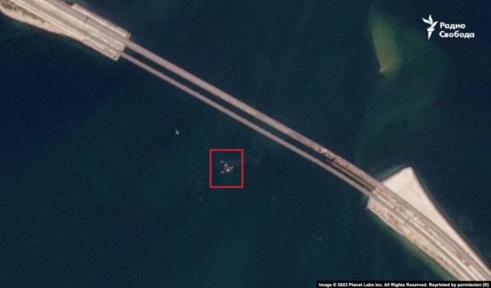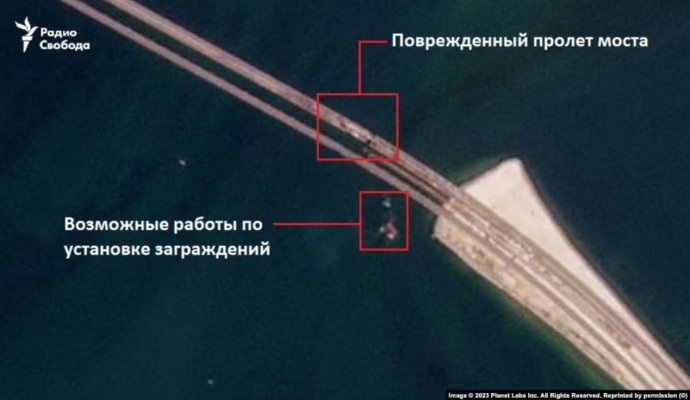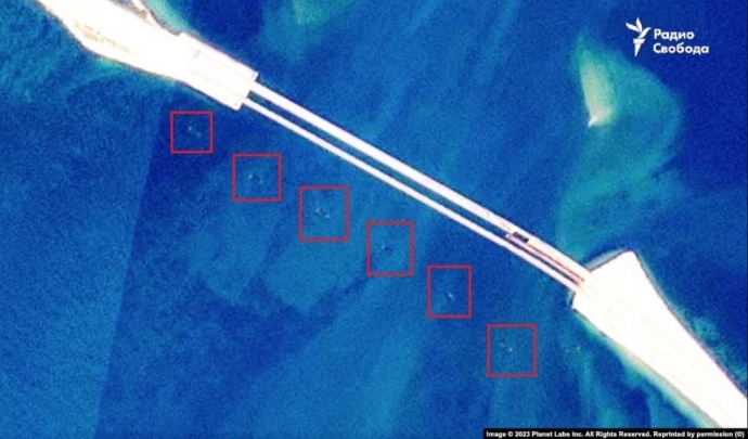Деталі: У розпорядженні ЗМІ з'явилися супутникові знімки сервісу Planet.com на яких видно, що на південь від мосту встановили баржі: вони не "затоплені", а, найімовірніше, закріплені якорями на одному місці.