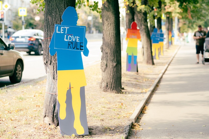 У центрі Харкова волонтерки розмістили 100 фігур людей, пофарбованих з одного боку у кольори прапору України, а з іншого – у кольори веселкового прапору, який є символом ЛГБТК+ спільноти.