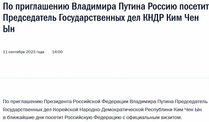 - 4 вересня The New York Times із посиланням на джерела повідомляло, що Кім Чен Ин планує цього місяця відвідати Росію, щоб зустрітися з Путіним і обговорити можливість постачання в РФ більшої кількості зброї для війни проти України.