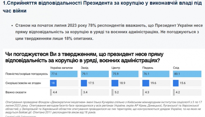Деталі: Соціологи констатують, що станом на початок липня 2023 року 78% респондентів вважали, що президент України несе пряму відповідальність за корупцію в уряді та воєнних адміністраціях. Не погоджувалися з цим твердженням лише 18% опитаних.
