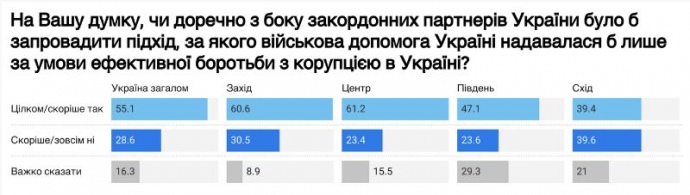 Дослівно: "Найбільше таке бачення взаємодії України з іноземними партнерами поділяють мешканці західних і центральних областей: 60,6% та 61,1% відповідно. На півдні ж лише 47% опитаних підтримують тезу про те, що боротьба з корупцією є передумовою військової допомоги. Найбільше опонентів цієї тези проживає у східних областях – 40%".