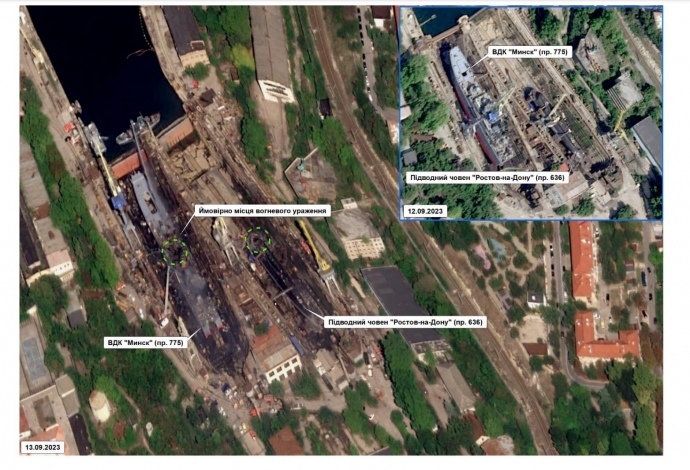 - Дослідники OSINT повідомили, що на судноремотному заводі в окупованому Севастополі пошкоджено два судна: великий десантний корабель класу Ropucha та підводний човен класу Kilo. Російський Telegram-канал Baza писав, що внаслідок атаки пошкодили великий десантний корабель "Мінськ" і дизель-електричний підводний човен "Ростов-на-Дону".