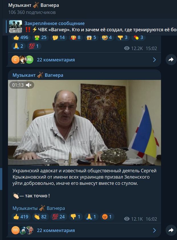 Встановлено, що "відеозвернення" фігуранта одразу підхоплювали російські інтернет-ресурси, серед яких Телеграм-канали "вагнерівців".