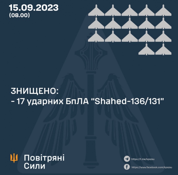 Усього зафіксовано пуски 17 ударних БпЛА, які по різних маршрутах рухались у напрямку Хмельниччини. Усі 17 "Шахедів" знищено протиповітряною обороною по маршруту слідування".