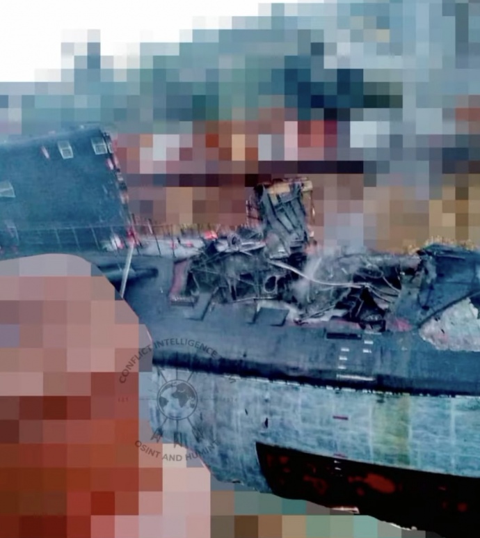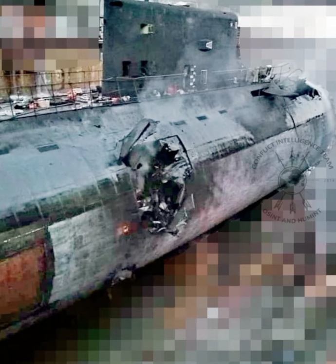 Доповнено: В Сonflict Intelligence Team, які опублікували знімки, зазначають, що підводний човен зазнав двох ударів. Перший із них розташований зверху в носовій частині субмарини, про нього на підставі супутникових знімків раніше заявляли експерти. Друге попадання припало на правий борт човна в зону за рубкою. Його, на відміну від першого, неможливо зафіксувати за супутниковими знімками.
