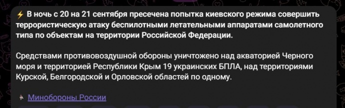 Також в Міноборони РФ заявляють, що засоби ППО знищили по одному БПЛА над Курською, Бєлгородською та Орловською областями.