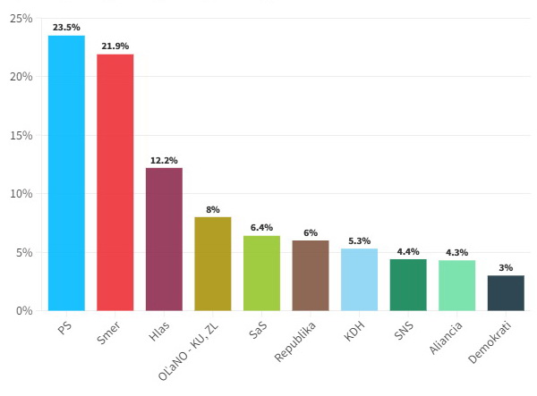 Натомість можливими коаліційними партнерами "Прогресивної Словаччини" можуть стати парті SaS (6,4%) та Християнсько-демократичний рух (5,3%).
