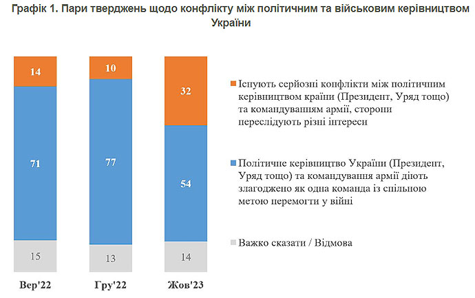 Дослівно КМІС: "За останній рік з 14% до 32% стало більше тих, хто вірить у наявність серйозних конфліктів між політичним керівництвом країни та командуванням армії. Разом з цим більшість населення України – 54% (у вересні 2022 року – 71%) – продовжують дотримуватися погляду, що політичне керівництво та військове командування діють злагоджено як одна команда".