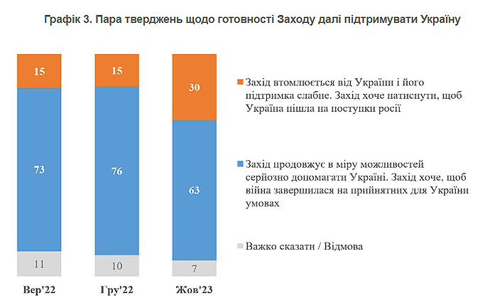 Але і тут соціологи наголошують, що все ж більшість населення країни наразі – 63% (у вересні 2022 – 73%) вважають, що Захід продовжує допомагати Україні і хоче, щоб війна закінчилася на прийнятних для України умовах.