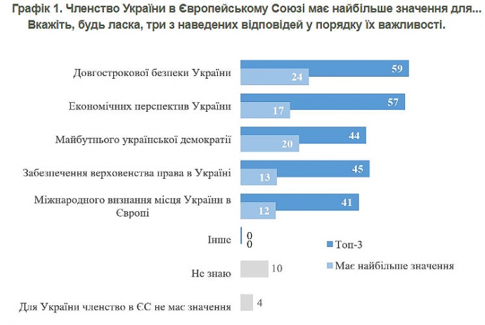 Серед найбільших мотивів підтримки вступу до ЄС українці називають забезпечення довгострокової безпеки (59% респондентів зараховують це до топ-3 мотивів) і економічні перспективи (57%).