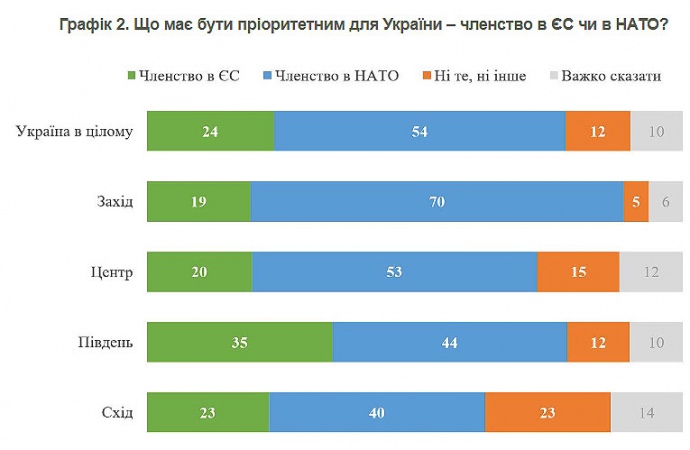 Дослівно КМІС: "54% українців вважають, що наразі більший пріоритет – членство в НАТО. Віддають перевагу членству в ЄС – 24% (решта респондентів або відповіли "ні те, ні інше" або не змогли взагалі відповісти). При цьому у всіх регіонах більше тих, хто віддає перевагу НАТО перед ЄС".