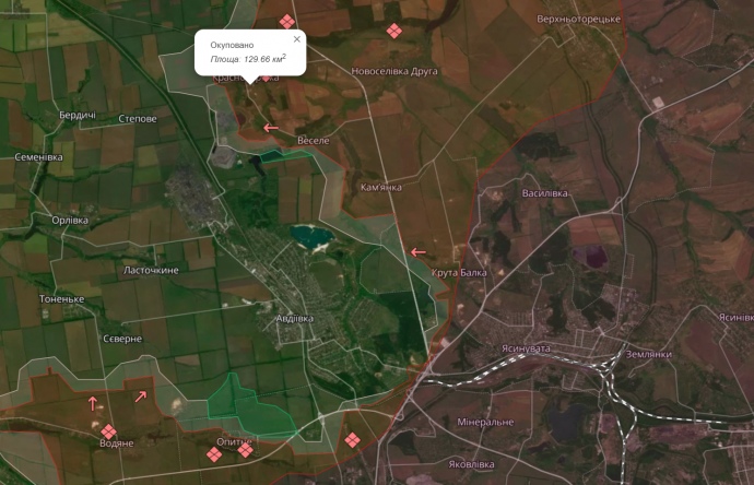 Наші розбиті колони біля Малої Токмачки, Вербового, Роботиного, Старомайорського, Новодонецького та Рівнополя, а також розбиті колони противника біля Вугледара, Новоєгорівки, Макіївки, Андріївки, Мар'їнки, а тепер ще й і Красногорівки (А) та Водяного-Первомайського, є зайвим доказом даної тези".