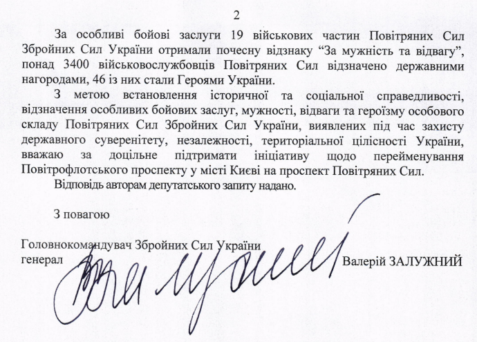 Деталі: Згідно з даними на сайті Верховної Ради, група народних депутатів на чолі з Романом Лозинським 5 жовтня направила запит на ім'я головнокомандувача ЗСУ з проханням висловити свою позицію із вказаного питання. 6 жовтня Залужний відповів нардепам, що підтримує ідею перейменування Повітрофлотського на проспект Повітряних сил у столиці.
