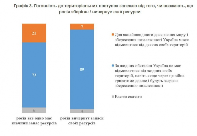 Разом з цим навіть серед тих, хто вважає, що росія має значні ресурси для тривалої війни, переважна більшість (73%) виступають проти жодних територіальних компромісів.