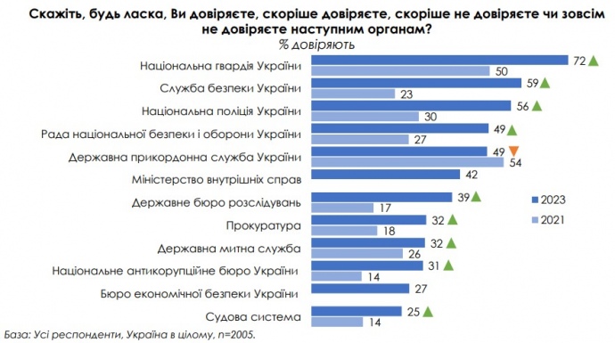 Дослівно: "Порівняно з 2021 роком серед українців помітно зросла довіра до більшості органів у секторі громадської безпеки. Так, для Національної гвардії довіра зросла з 50% до 72%, для СБУ – з 23% до 59%, для НПУ – з 30% до 56%, для РНБО – з 27% до 49%.