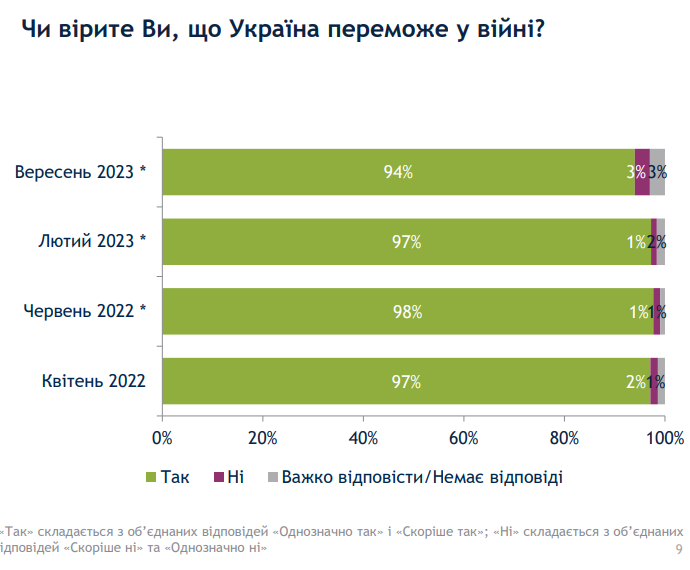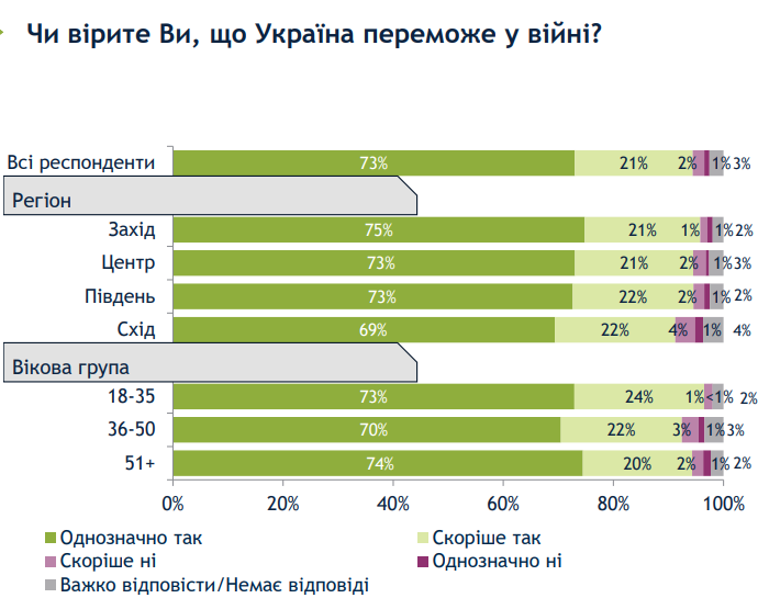 Деталі: На запитання "Чи вірите ви, що Україна переможе у війні?" "однозначно так" відповіли 73% опитуваних, "скоріше так" – іще 21%.