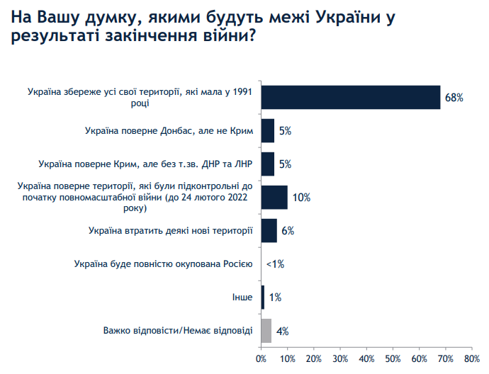 В те, що Україна збереже усі свої території, які мала у 1991 році, вірять 68% опитаних. Менше 1% думають, що Україна буде повністю окупована Росією.