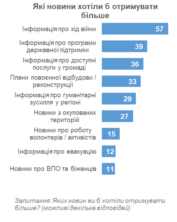 Дослівно: "Щодо новин, які би хотіли отримувати більше – 57% (жителів прифронтових територій - ред.) говорять про інформацію про хід війни. Далі йдуть інформація про наявні програми державної підтримки для громадян (39%), про доступні в громаді послуги (36%) і плани відбудови (33%).