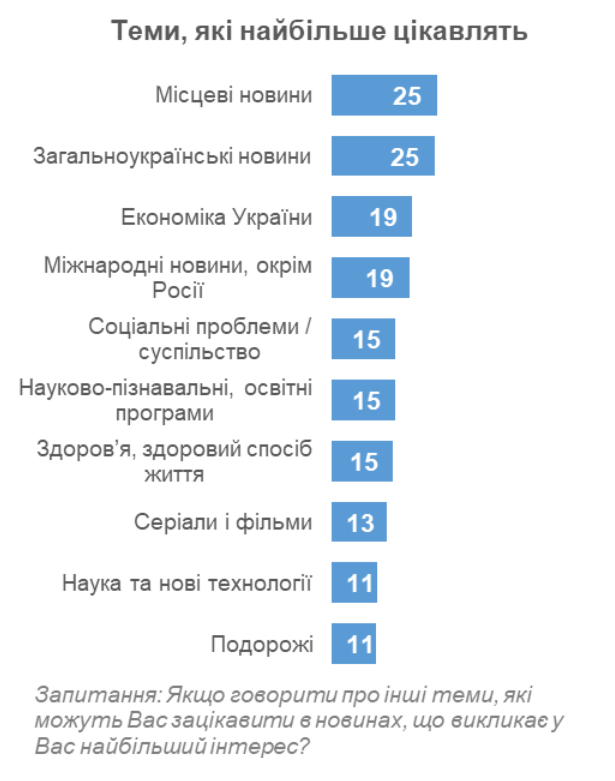 Деталі: При цьому 65% віддають перевагу отриманню новин у форматі відео. Переважно мова йде про відео до 15 хвилин. Також 53% віддають перевагу коротким інформаційним повідомленням. Про зображення говорять 25%, а про довгі статті – 6%. Формат подкастів чи радіо приваблює 7%.