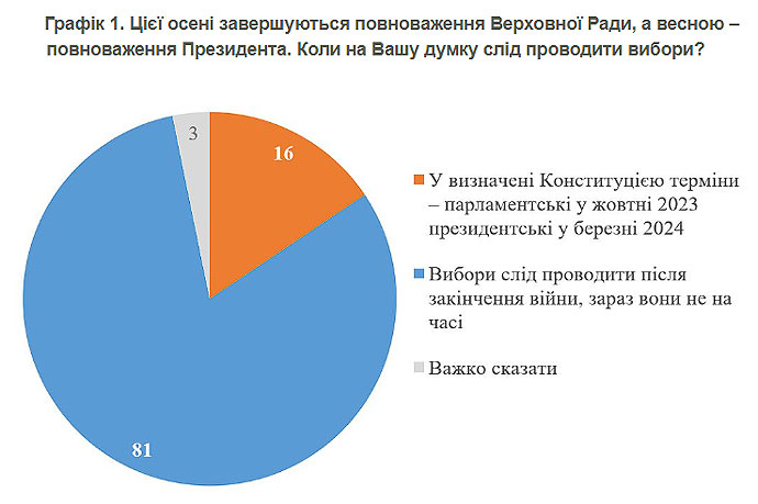 Дослівно КМІС: "Станом на жовтень 2023 року 81% респондентів вважають, що вибори мають проводитися після війни і зараз вони не на часі. Вважають, що вибори вже мають проводитися попри війну – 16%".