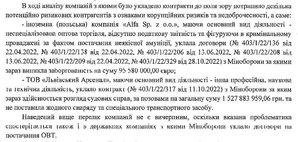 Так, "Alfa" займається неспеціалізованою гуртовою торгівлею, не має податкової звітності й фігурує у кримінальному провадженні за фактом постачання неякісної амуніції. Проте вона уклала договори з Міноборони, за якими виникла заборгованість на суму майже 95,6 млн євро.