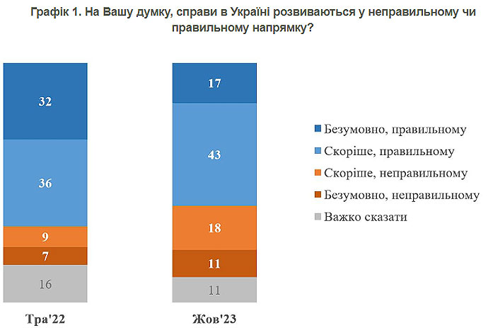 Дослівно КМІС: "Між травнем 2022 року і жовтнем 2023 року стало з 68% до 60% менше тих, хто вважає, що справи в Україні розвиваються у правильному напрямку. Водночас частка тих, хто вважає, що справи йдуть у неправильному напрямку, зросла з 16% до 29%".