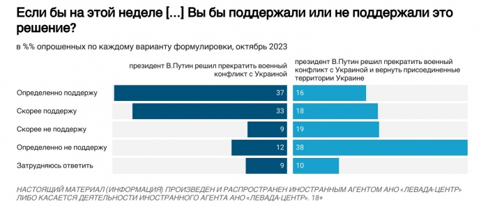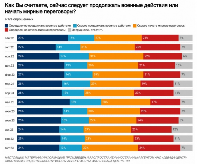 Водночас 55% опитаних громадян РФ вважають, що слід припиняти війну і починати мирні переговори, 38% виступають за продовження військових дій.