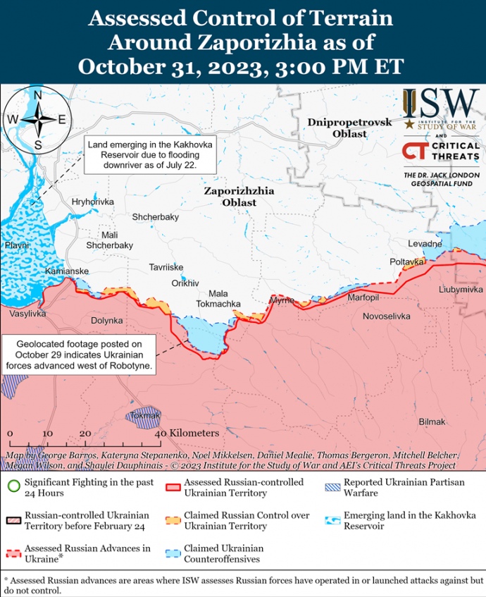 Російські війська контратакували на заході Запорізької області 31 жовтня, але не досягли жодних підтверджених успіхів. Український Генеральний штаб повідомив, що російські війська безуспішно намагалися відновити втрачені позиції поблизу Роботиного.