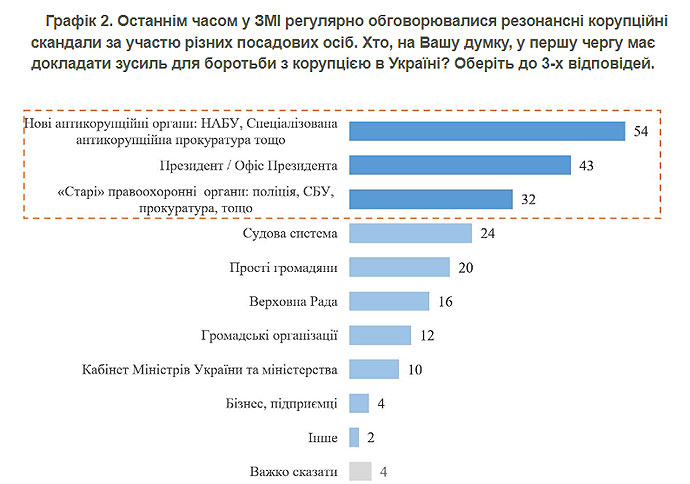 54% опитаних переконані, що боротися з корупцією насамперед мають нові антикорупційні органи, створені після 2014 року. Водночас досить багато респондентів також говорять про президента/Офіс президента (43%) і умовно "старі" правоохоронні органи, як-от поліція, СБУ, прокуратура.