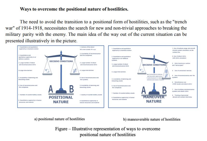 Необхідність уникнення переходу від позиційної форми до маневреної зумовлює пошук нових і нетривіальних підходів до порушення військового паритету з противником".