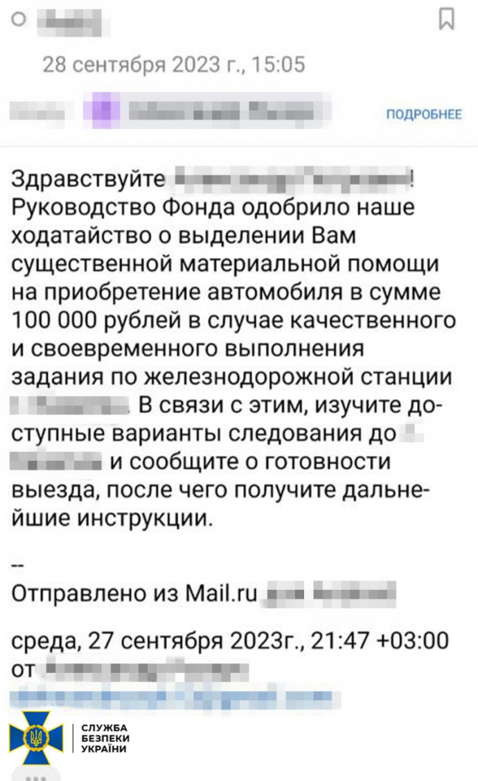 У разі успіху ворожої операції російська спецслужба, за інформацією СБУ, "гарантувала" своєму агенту грошову винагороду у розмірі 100 тисяч рублів. Після виконаного завдання зловмисник сподівався на те, що його евакуюють на територію Росії.